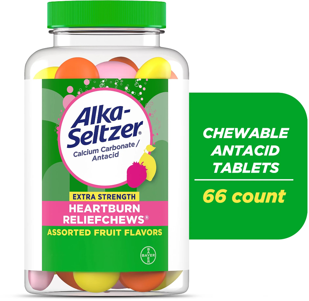 Comprimidos mastigáveis para alívio de azia com sabor de frutas. Este é o seu tipo de alívio rápido de azia, indigestão e dor de estômago. Pastilhas mastigáveis que são fáceis de levar com você e vêm com sabor de frutas sortidas.
