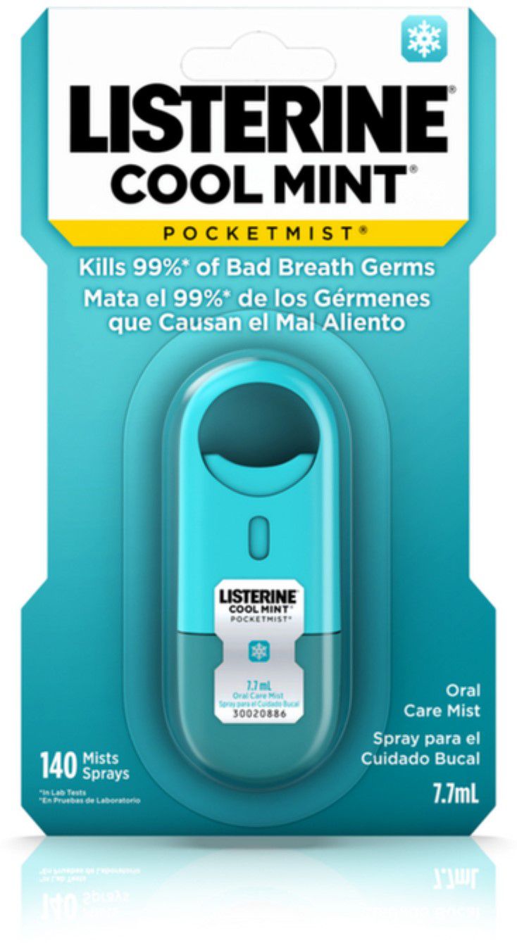 Refresque o seu mau hálito com o Oral Care Mist Listerine Pocketmist Cool Mint. Este spray oral mata 99,9 por cento dos germes que causam o mau hálito para uma sensação de respiração limpa e fresca na boca. É pequeno o suficiente para caber em seu chaveiro, ou em sua bolsa ou bolso, para que você possa respirar fresco, não importa onde você vá.