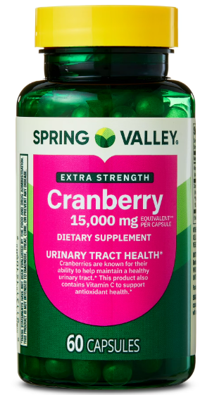 O Suplemento Alimentar Spring Valley Extra Strength Cranberry é um suplemento desenvolvido para auxiliar na saúde do trato urinário. Os cranberries são conhecidos por sua capacidade de ajudar a manter o trato urinário saudável.* Cada cápsula contém 300 miligramas de concentrado de cranberry e 100 miligramas de vitamina C para auxiliar na saúde antioxidante. A dosagem sugerida para adultos é de uma cápsula duas vezes ao dia, de preferência com as refeições. Estas cápsulas são isentas de glúten, laticínios, soja e amendoim, e não contêm corantes, adoçantes ou conservantes artificiais.