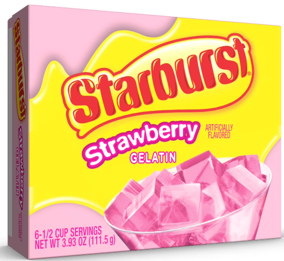 A gelatina Starburst é perfeita para os dias quentes de verão ou sempre que você ou seus filhos precisarem de um doce. A gelatina Starburst All-Pink Morango é refrescante e sem gordura, com apenas 70 calorias por porção. Perfeita para lanches depois da escola, dias na piscina ou piqueniques, esta gelatina com sabor de morango é fácil de preparar e consumir diretamente da sua caixa de papelão, que não pode ser congelada. Prepare a gelatina como se fosse o seu lanche favorito da infância. Adicione água fervente, mexa a mistura de gelatina até dissolver completamente, adicione água fria e leve à geladeira até firmar e estar pronta para comer. Toda a família vai adorar a mistura para gelatina Starburst!