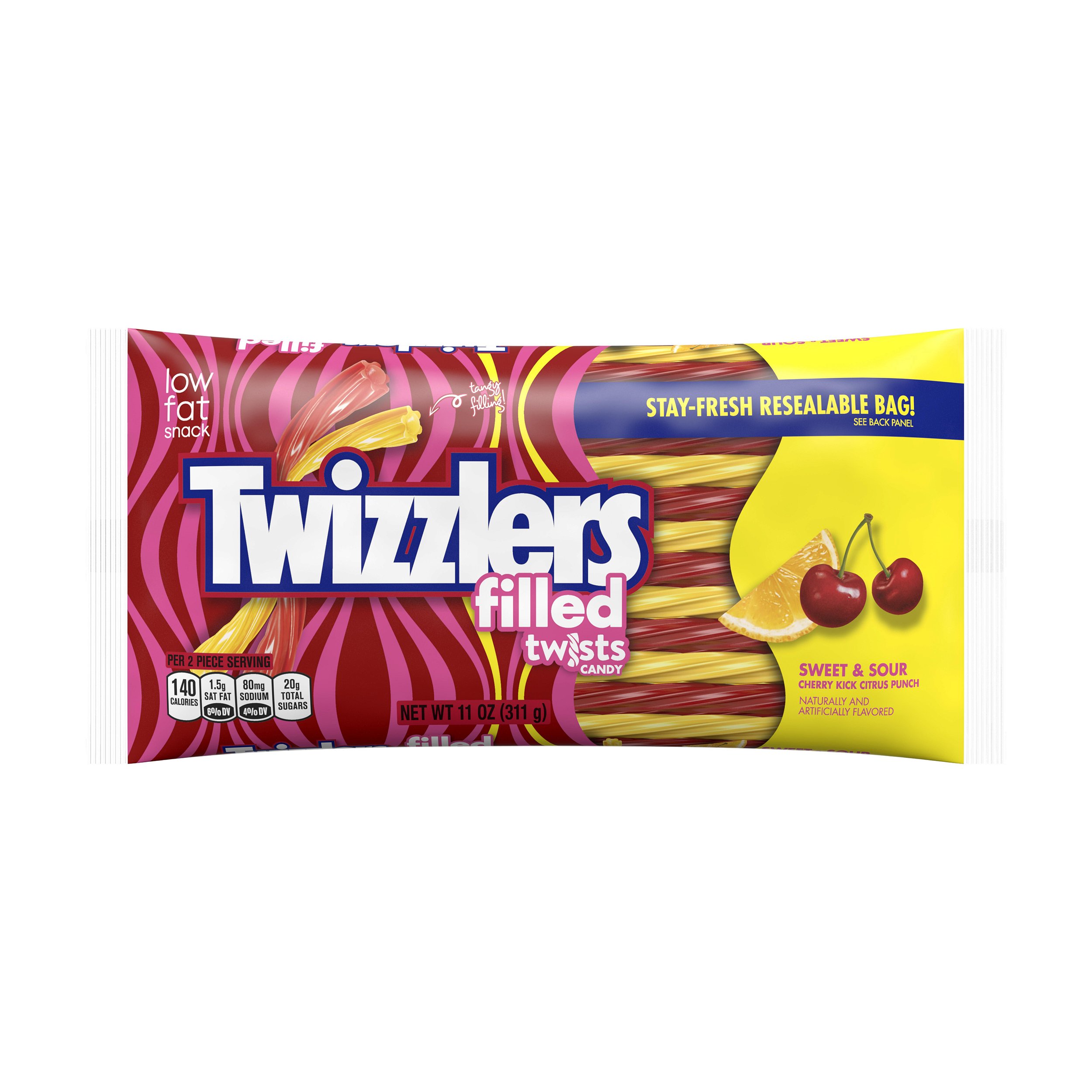 Fãs de ponche cítrico de limão e cereja vão adorar os alcaçuzes mastigáveis com recheio de ponche cítrico de limão e cereja Twizzlers Twists que são a maneira perfeita de desfrutar de um doce saboroso em casa ou no trabalho.